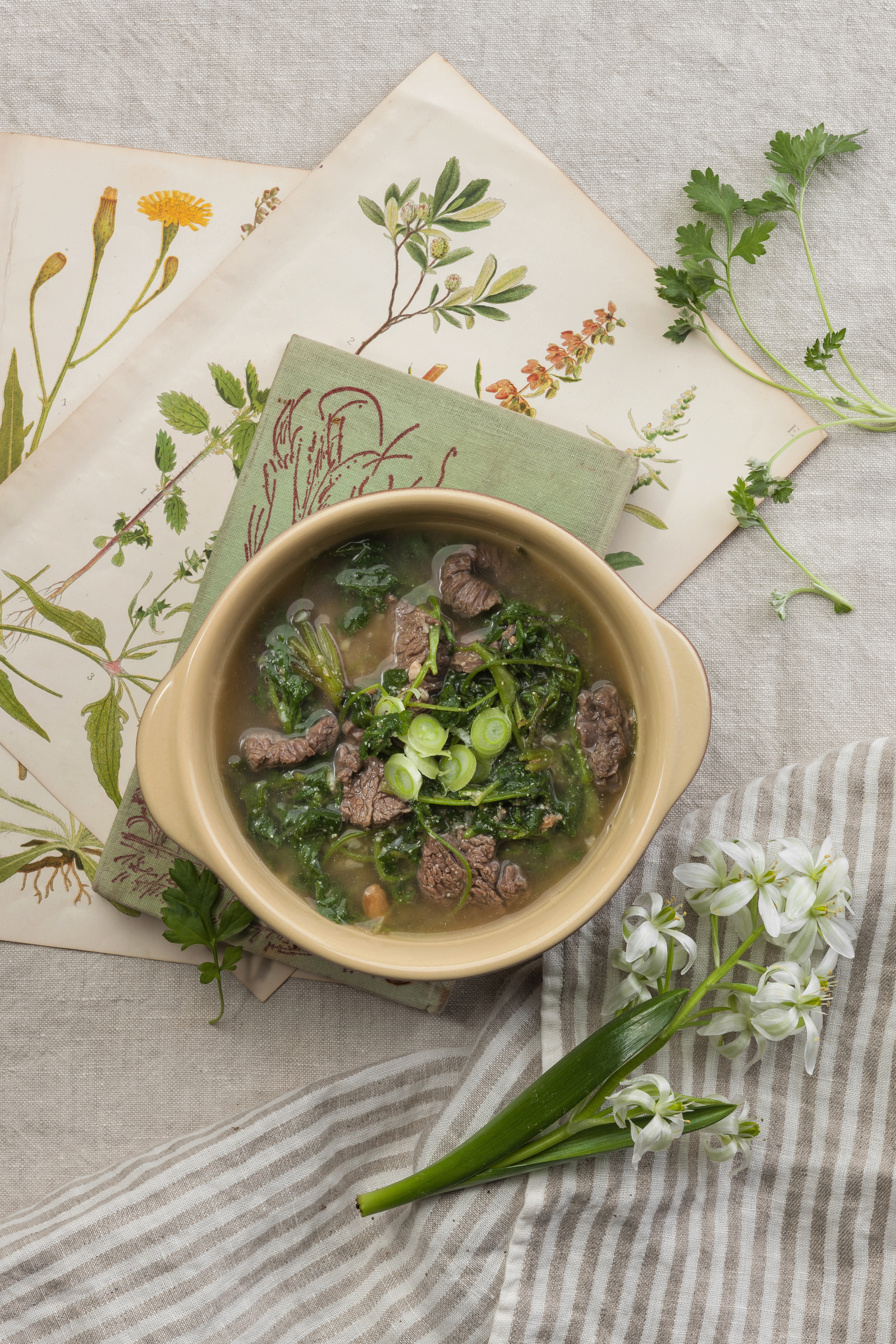 진한 한우 사골 육수에 만두와 채소를 푸짐하게 끓여낸 국물